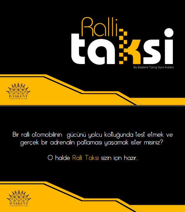 Başkent Turing Spor Kulübü olarak, otomobil sporlarına olan tutkumuzu ve deneyimimizi daha geniş kitlelere ulaştırmak için Ralli Taksi projemizi hayata geçiriyoruz! Bu proje, ralli sporuna ilgi duyan herkes için eşsiz bir fırsat sunarak, yeni yeteneklerin keşfedilmesini ve ralli dünyasına adım atmalarını sağlayacak. Ralli Taksi, katılımcılara otomobil sporlarının heyecanını deneyimleyerek öğrenme imkânı tanıyan kapsamlı bir eğitim programıdır. Projemizin ilk adımı olarak, katılımcılara Ralli 101 eğitimi verilecek. Bu eğitim, ralli sporunun temellerini anlamalarına yardımcı olacak ve sürüş teknikleri, güvenlik önlemleri ve co-pilotluk rolü gibi kritik konuları kapsayacaktır.